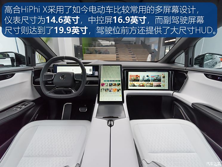 先来看看硬件,我们体验的HiPhi X全系搭载14.6英寸全液晶仪表,中控屏尺寸为16.9英寸,而副驾驶屏幕尺寸则为19.9英寸,同时,全系车辆还都配备了大尺寸的HUD抬头显示,从硬件来看,HiPhi X的配置可以说是非常不错了。