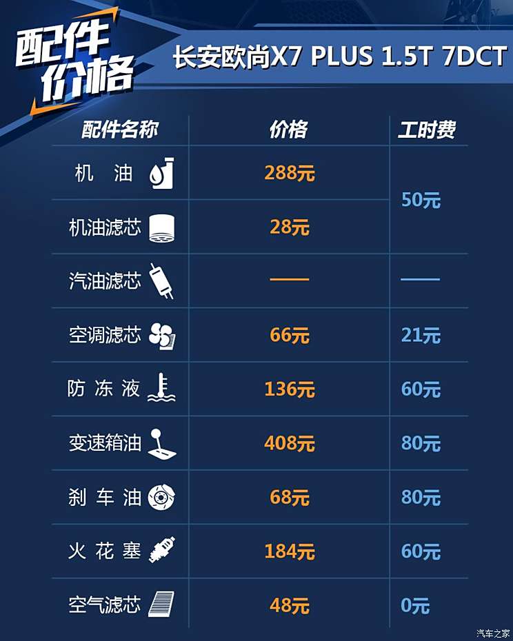 [汽车之家 养车成本] 长安欧尚X7 PLUS(参数|询价)上市于2021年10月,从名称就能得知这是欧尚X7的升级版,该车全系标配1.5T排量发动机,有高低功率之分,高低功率发动机分别匹配湿式双离合与手动变速箱。目前,我们已经收集到了装配1.5T蓝鲸发动机、匹配湿式双离合变速箱车型的保养信息,那接下来就由我为大家算算该车的养车成本吧。(注:该保养信息采集地为石家庄,各地区或因经济差异存在工时费差异,保养信息供参考。)