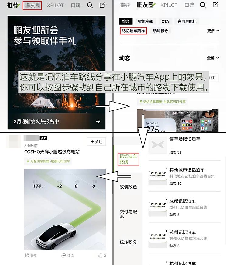 如果熟悉目标地下车库的小鹏车友分享了记忆泊车路线,根据“电梯口”、“充电桩”等标注,其他小鹏车友就完全可以避免找路的麻烦了。