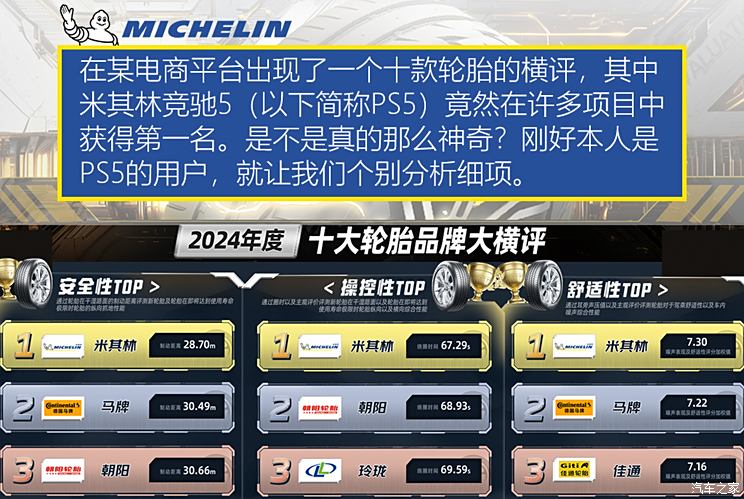 而PS5在这九个环节中,1.湿地制动(磨损胎)、2.干地制动、3.湿地操控、4.磨损胎湿地操控、5.干地操控、6.舒适性等6各项目中得到冠军。而湿地制动(新胎)则是拿到第二名。