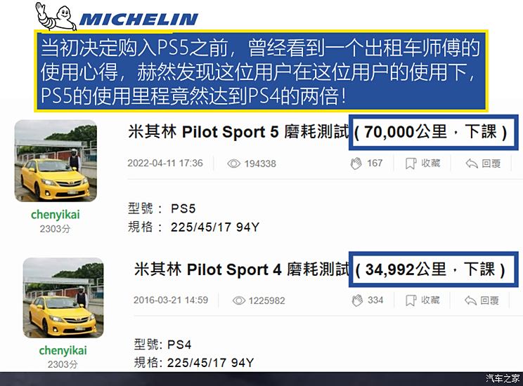 到目前为止,除了原厂的玛吉斯轮胎,我还用过四组轮胎,这四款轮胎都有非常明显特征,长处很明显,缺点也很明显。通常注重赛道性能的轮胎,对于舒适性、静谧性都没有很好的表现。也由于本人的使用场景多了“载长辈”这个部分,所以,我必须寻找一款“能兼顾一定抓地性,但是舒适性、经济性都要有不错表现的产品”,于是,我的心思又动到了米其林竞驰5(以下简称PS5)的头上。
