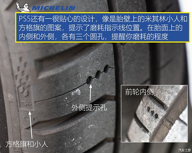 另外,PS5在细节上也很注意,你可以看到胎壁上有米其林小人和方格旗的图案,很好地提示你磨耗指标在哪里。除了磨耗指标外,轮胎最内侧和最外侧都有三个提示孔提醒你磨耗的程度。胎壁的设计也很好看,如果你非常重视外观,相信它是一条很“百搭”的轮胎。虽然这都只是一些小细节,但是给人的体验感就是比较好。