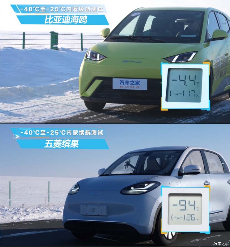 由此可以看出,小续航相比大续航的车温度差异还是比较明显的,其实由于续航里程引起的温度差异我是可以理解并且认同的,因为在极寒环境下,纯电车型的实际续航里程本来就会大打折扣了,若还依然不管不顾的将剩余电量用于制热的话势必会对车辆的正常使用造成很大影响。两个十分生动的例子就是比亚迪海鸥以及五菱缤果(参数|询价),下车温度分别为-4.4°C和-9.4°C。