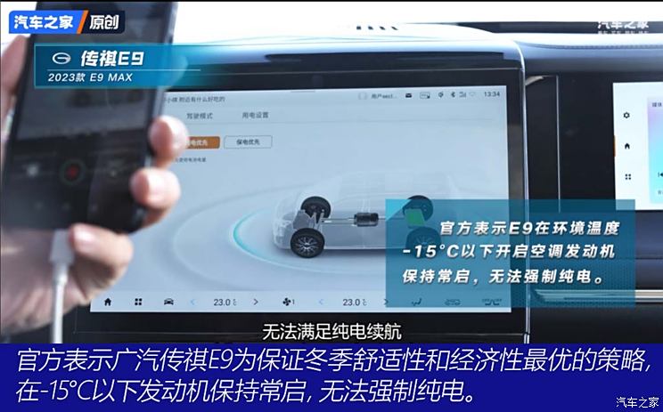除了特斯拉以外还有一个车型值得一提,那就是广汽传祺E9,这辆车未能参加本次超测的极寒温区续航测试,原因是车辆在极寒环境中只能在混动模式下开启空调,不符合本次的续航测试规则。