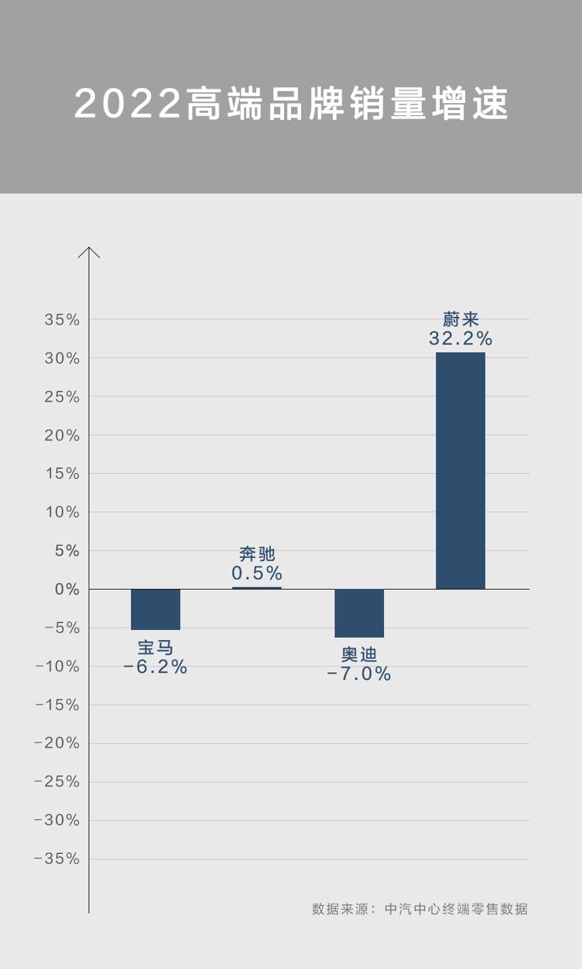 乘联会在总结2022年车市时就特别指出,当前自主高端市场势头正旺,国人对自主高端的信任度和美誉度不断提升。在电动化的浪潮下,高端豪华也在拥抱绿色环保低碳,近期的高端豪华市场的新能源车表现强劲,主力正是以蔚来为代表的自主品牌。数据显示,2022年蔚来实现了的34%的同比增幅,增长幅度冠绝中国豪车市场,作为对比,传统豪车三强BBA 2022年在华表现就要逊色不少,其中只有奔驰实现了正增长,微增0.5%,奥迪和宝马均出现了销量下滑,奥迪在华销量下降7%,宝马下降 6.2%。