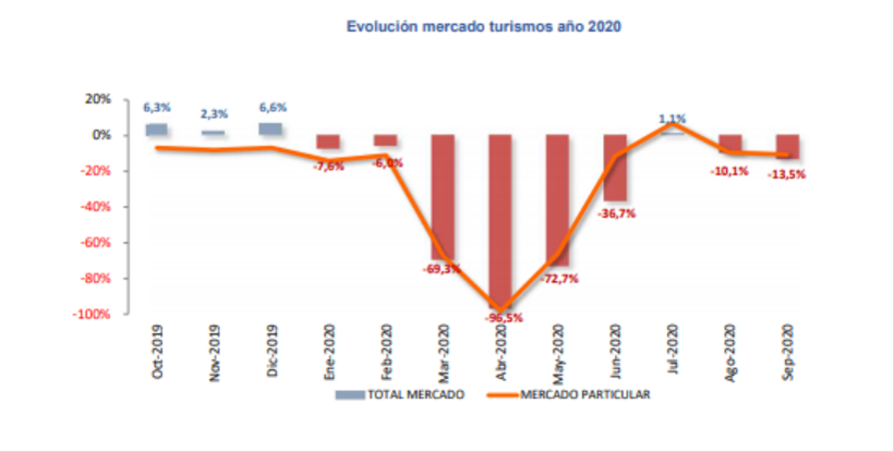 2019年10月至2020年9月西班牙汽车销量走势(图片来源:ANFAC)
