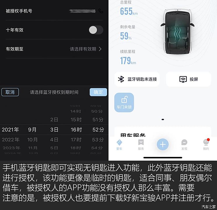 下载好APP后,扫描屏幕中二维码即可完成绑定,此时即可实现手机蓝牙钥匙(及分享)、远程开锁/解锁、开关车窗、启动/关闭空调、预约充电等功能,这些功能咱边用边说。