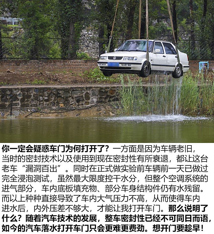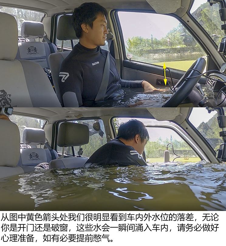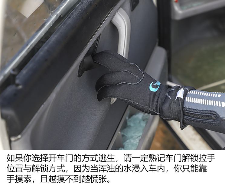 在车辆进水时,如果我们没有趁手的“兵器”,第一时间想到的往往是开门逃生,但不少人都曾谈及过车内水到达一定高度后,打开车门费劲甚至是无法打开,其实这种说法不无道理,主要是由于车内外压力差引起的,即车辆落水之初(假设车外淹没至腰线),车内进水量很少,而作用在车内门饰板的压力只有大气压,但对于车外来说,除了气压还有淹没腰线部分的水压。而你推门要用的力显然要将水压考虑进去,而当车内浸满水,内外不存在压力差,即都是水压,此时则可顺利推开门。那么今天我们就先为大家试试不同水位逃生到底要废多大劲或者是否能成功。