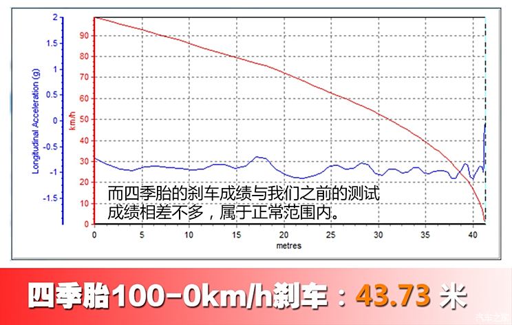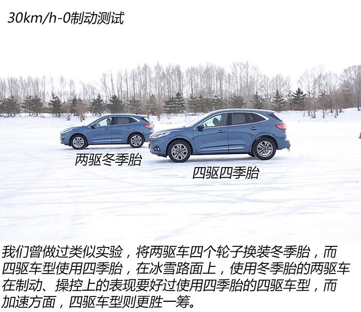 但是,经过我们实验,完全相同的车型在环境温度为零度的测试场,冬季胎的刹车距离反而比四季胎要长7米多,所以只用温度作为衡量是否更换冬季胎显然不太够,那么我们继续看冬季胎的另一个特点:花纹块。