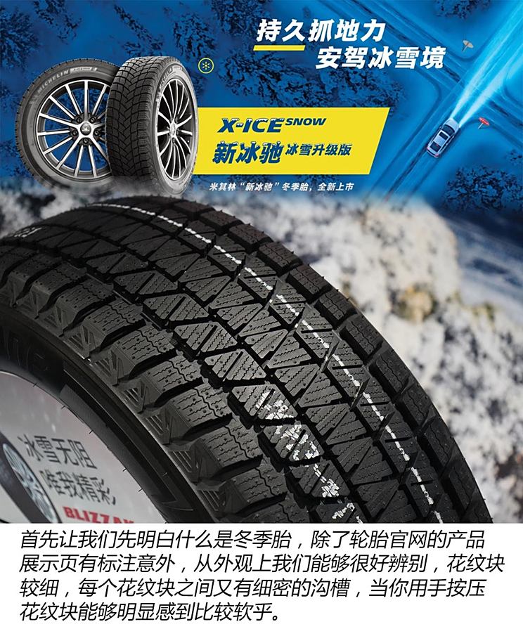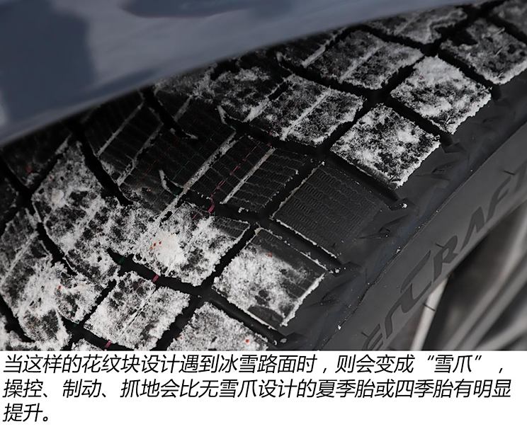 首先让我们先明白什么是冬季胎,除了轮胎官网的产品展示页有标注意外,从外观上我们能够很好辨别,花纹块较细,每个花纹块之间又有细密的沟槽,当你用手按压花纹块能够明显感到比较软乎。