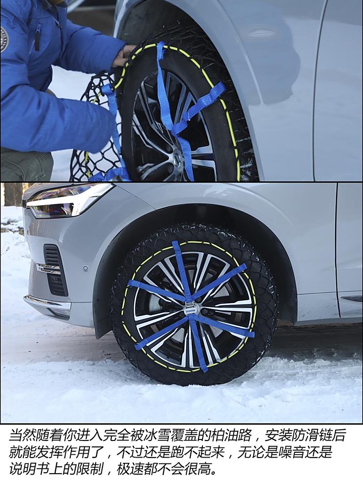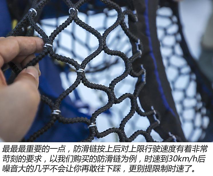 为此我们还真做过一个测试,同动力同驱动行驶的车,一个换冬季胎一个见到雪后换装防滑链,从结果来看冬季胎完胜。无论是操控、制动,噪音的抑制还是极限行驶速度,冬季胎赋予车辆的能力都远非防滑链能比拟的,详情点击此处回顾文章,另外这里有几个细节想跟大家分享。