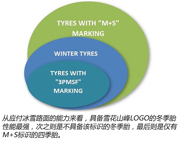 有些轮胎上会有一个雪花山峰logo,想要在自家生产的轮胎上印上雪花山峰LOGO,就要通过由联合国欧洲经济委员会制定的测试标准。测试内容主要就是雪地刹车与“加速”,其实用加速来表述有些歧义,官方称之为牵引力测试,直接理解为刨雪能力即可。在硬雪3cm+浮雪2cm的路上进行上述测试,且对温度、湿度都有着相当严苛的要求,而只有当测试成绩超越标杆轮胎10%后即可获得该标识。有趣的是,所有轮胎的测试成绩并不对公众开放,只有通过与未通过两种。所以如果追求比较强悍的冰雪性能,认准有这个轮胎的标识即可。