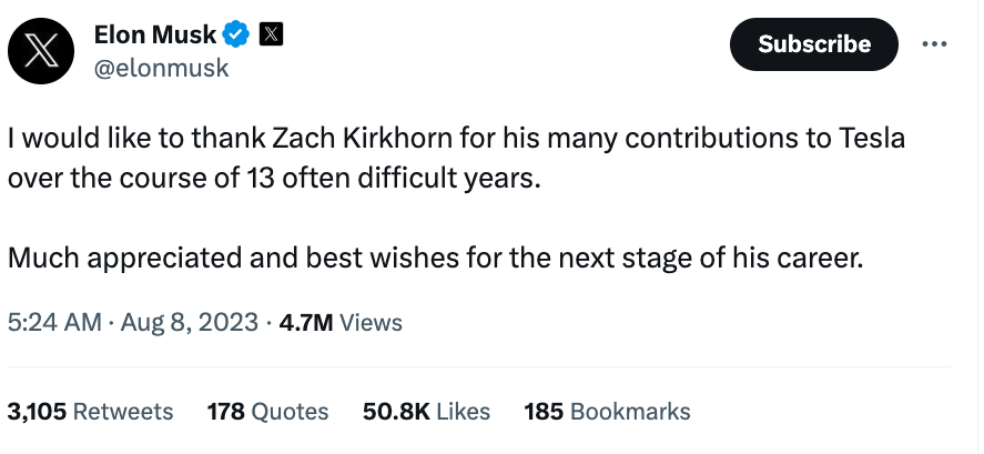 不过有意思的是,在公布离职消息前,根据提美国证券交易委员会(SEC)文件显示,他今年已经抛售价值600多万美元的特斯拉股票。