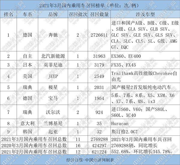 根据国家市场监督管理总局缺陷产品管理中心3月发布的召回公告,经济日报-中国经济网汽车频道经过汇总、统计,整理出“2021年3月国内乘用车召回榜单”。3月,国内乘用车市场共有9个品牌累计发布11起公告,共计召回乘用车2769288辆,同比增长552.68%,环比增长345.78%,召回规模连续第2个月激增。