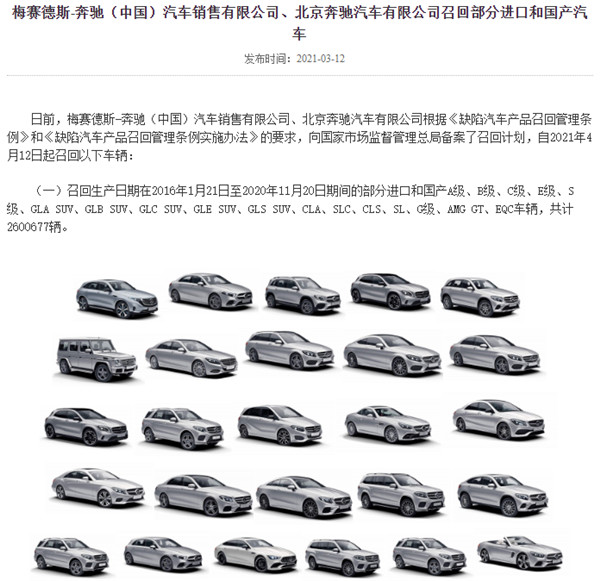 3月,奔驰发布2起大规模召回,由此推高了德系品牌召回总量。尤其是3月12日,奔驰一举召回260.10万辆汽车,涉及进口和国产几乎全系车型,召回原因是“车辆通信模块故障,或导致车辆的紧急呼叫服务将无法使用”。