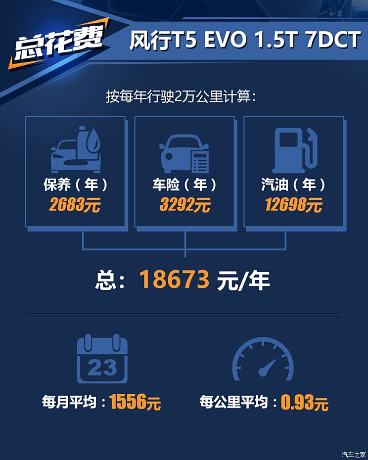 风行T5 EVO在不脱保的前提下,保修期达到了8万16万公里,是该车的最大优势,对于用户来说,是一份长久的保障。车辆的保养周期为5000公里/次,属于比较常规类型。按照每年2万公里行驶里程计算,3年6万公里的常规里程内,每年的保养成本为2683元,总的养车成本与当下较高的油价关联性很高,而该车7升/百公里的油耗,属于相对较少的一类。(文/汽车之家 王鹤璇)