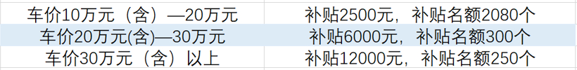 此外,补贴方式按照政府补贴与商家优惠相结合,其中政府补贴部分按车辆购置价格(不含税)分档补贴,并且补贴名额有限;商家自愿推出配套优惠,优惠方式可采取现金、服务、实物、装潢等形式不限。