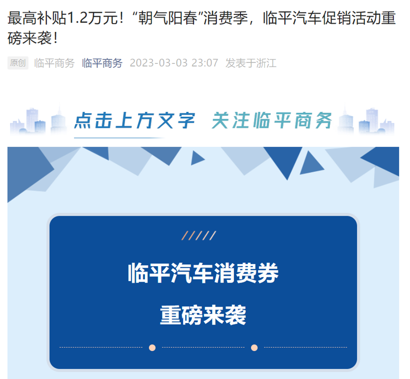 - 489杭州市临平区推出汽车促销活动,最高补贴1.2万