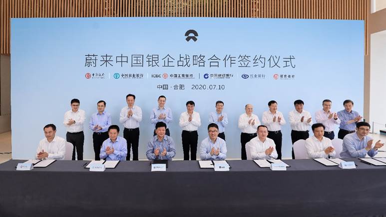 2020年7月10日上午,蔚来中国与中国建设银行安徽省分行等六家银行举行了蔚来中国银企战略合作签约仪式。合肥市委常委、常务副市长罗云峰,安徽省投资集团控股有限公司党委书记、董事长陈翔等领导以及蔚来创始人、董事长、CEO李斌共同出席本次签约仪式。