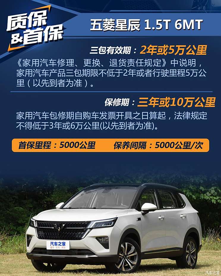 五菱星辰全系搭载1.5T发动机,有6MT与CVT两款变速箱与之匹配,整车的三包有效期为2年或5万公里,保修期为三年或10万公里,属于乘用车常见水平。首保里程为5000公里,后期保养间隔同样为5000公里/次。介于手动挡、自动挡车型变速箱油更换成本差异以及油耗的区别,不同动力组合我会为您分开展示,咱先看看相对实惠的手动挡车型。