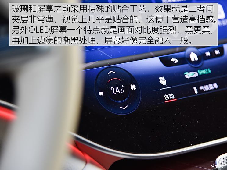 这一整块玻璃覆盖屏幕的方案被称为“Hyperscreen超级屏幕”,在海外市场,这是选装项,否则和全新S级一样就是仪表和中控屏分开的样式。因为一体式曲面玻璃、玻璃和屏幕采用的特殊贴合工艺、对比度强烈的OLED屏幕等因素,中控台部分甚至真的实现了“一整块屏幕”的视觉效果,很出色。