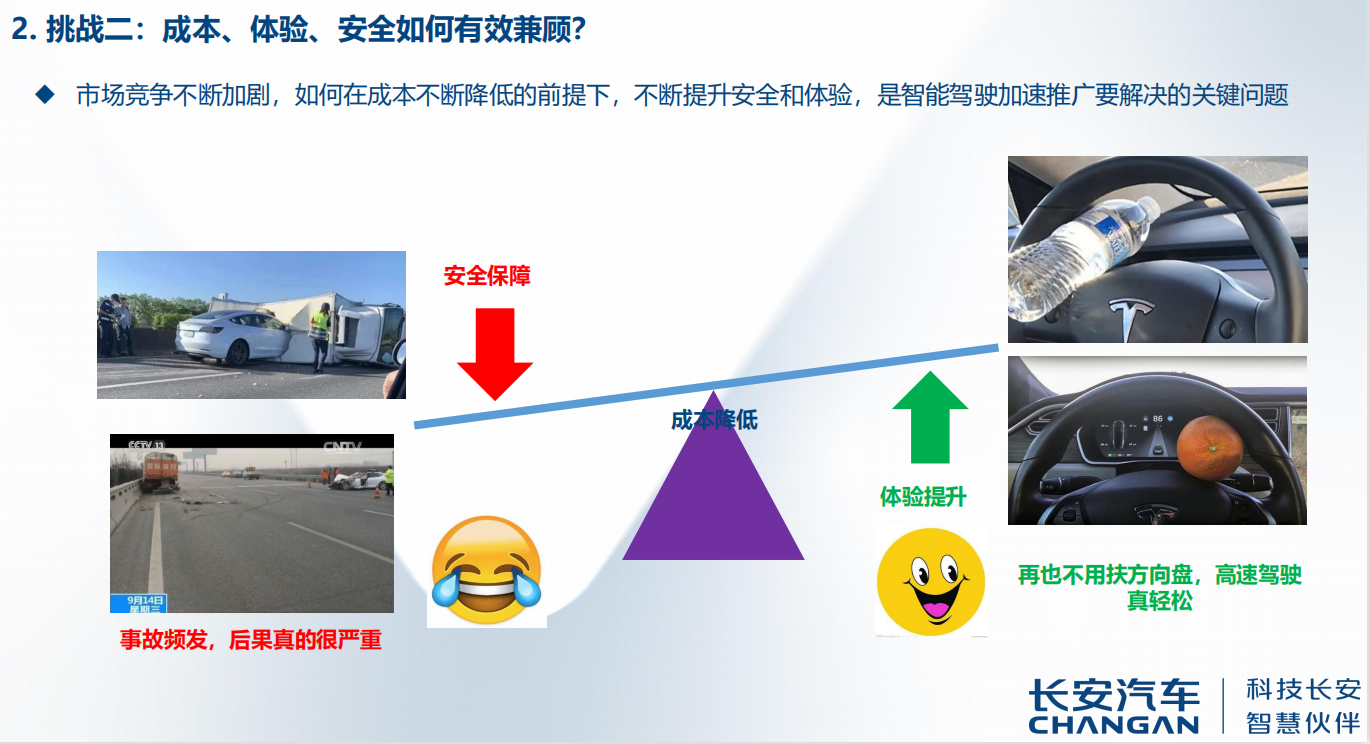 目前用户端的智能驾驶已经普及,体验感较好。随着成本不断降低,规模化和标准化普及后,用户会产生分级:一是信任,下图是一个真实案例,有用户反馈说其朋友开特斯拉高速中睡觉,是按照以下方式解决方向盘的问题,从技术角度来看,这是非常危险的行为。然而用户选择信任智能驾驶,所以不断提升安全和体验,是智能驾驶加速推广要解决的关键问题;二是极端用户不信任,认为使用智能驾驶比自己开车更紧张。因此如何让智能驾驶更安全、好用,也是未来需要解决的问题。