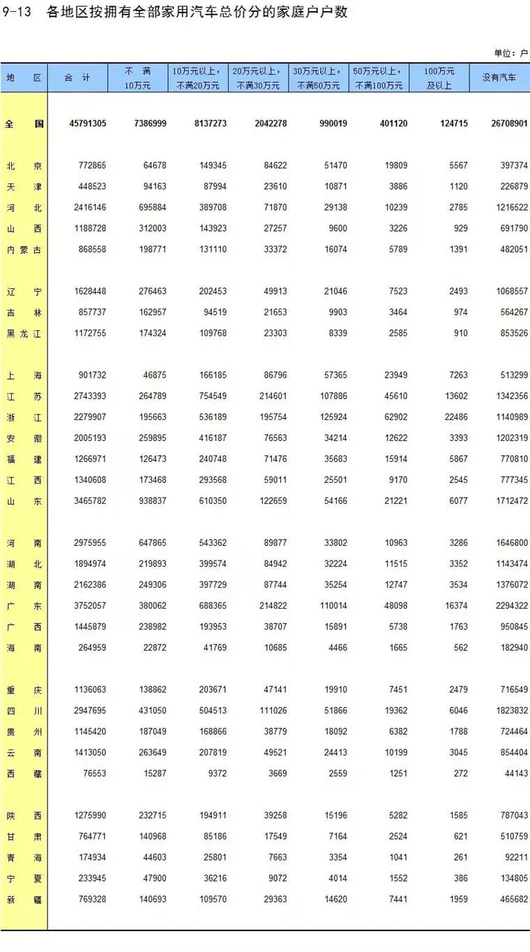 记得在第七次人口普查统计年鉴中,有一组关于《各地区按拥有全部家用汽车总价分的家庭户户数》的数据,其中便提及,家用汽车总价在30万元—50万元以内的家庭户数为990019户。尽管第七次人口普查统计时间距今已经过去了一年多,但是这一数据依旧有参考意义。