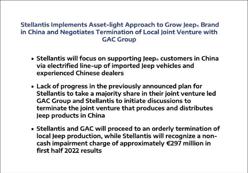 7月18日,Stellantis集团有意识地表示,由于与广汽集团在事关双方合资公司广汽菲克接下来的发展上,始终未能取得进展,将与广汽集团协商终止本地合资公司的运营。今后,Stellantis集团运营Jeep将回归至曾经的生存模式,即:仅保留Jeep品牌的进口汽车业务。