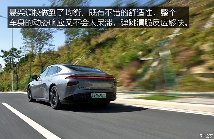 小鹏P7的底盘调校也能感受出它是一辆家用取向的车型,就是很典型的中型车味道,目标是舒舒服服的驾驶感觉。不过,悬架的支撑性不错,高速稳定性表现令人满意,较低的车身再加上底部电池包的配重,时刻“贴地”的动态反馈给人干脆的行驶质感。