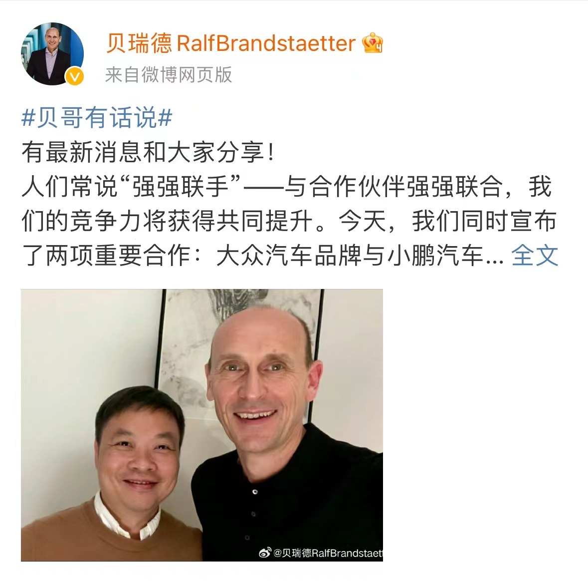 大众汽车集团(中国)首席执行官贝瑞德(Ralf Brandstätter)与小鹏汽车董事长兼首席执行官何小鹏近期进行了多次会面。据知情人士透露,何小鹏在会谈中表示,他可以想象与大众的长期合作。大众中国表示,双方谈了8个月,紧密沟通了很多次,双方已经非常熟悉,“与小鹏汽车的合作在经济性和技术方面都有清楚的逻辑”。